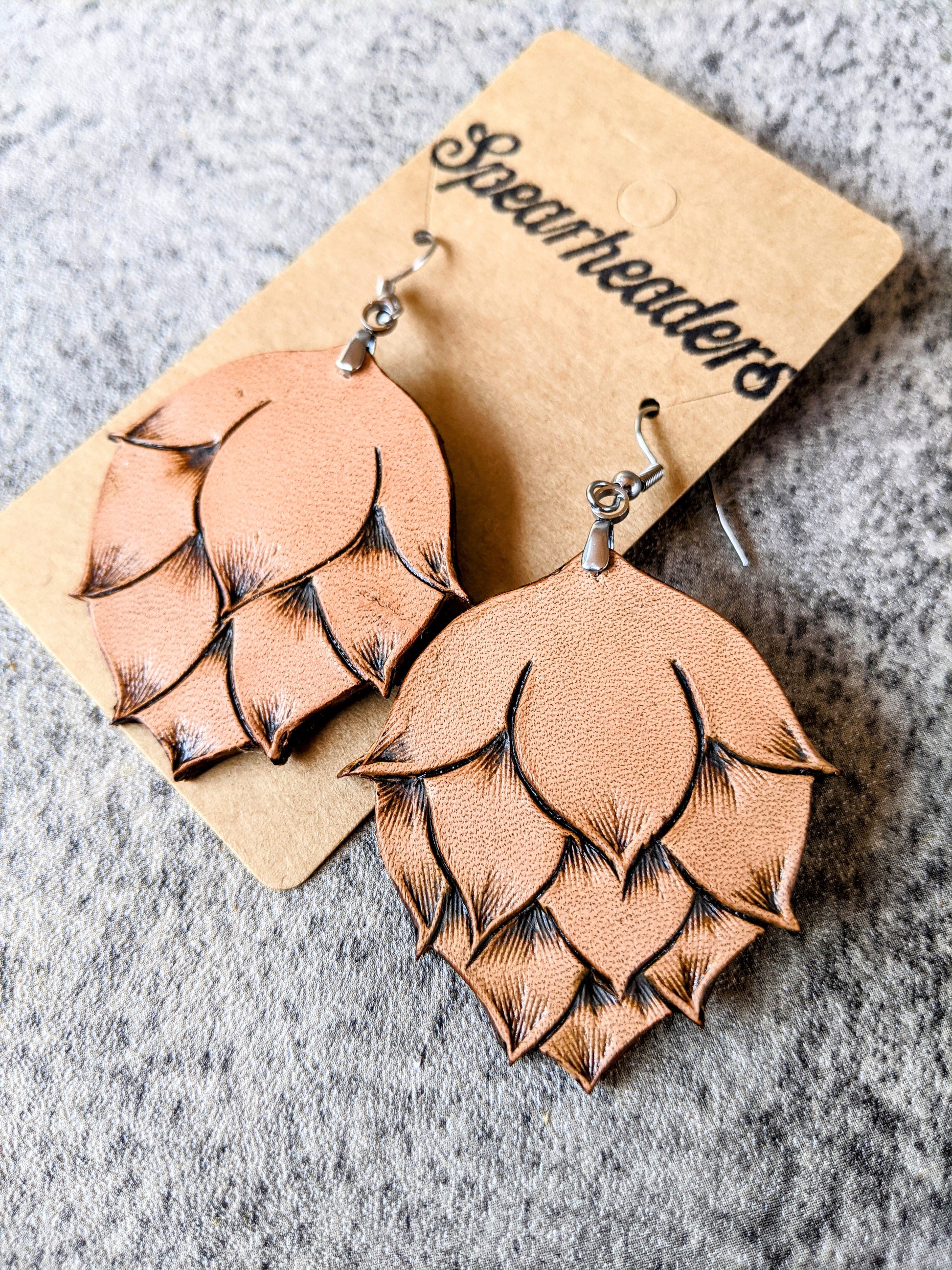 Perfect for visiting the local brewery or taphouse, these beauties will show off your love of craft beer. Brewery Hops Earrings are hand-tooled leather dangles. Each pair is a work of art so each pair will have subtle differences. Yours will be one of a kind. Sure to impress your beer snob buddies. Order yours now while you can!